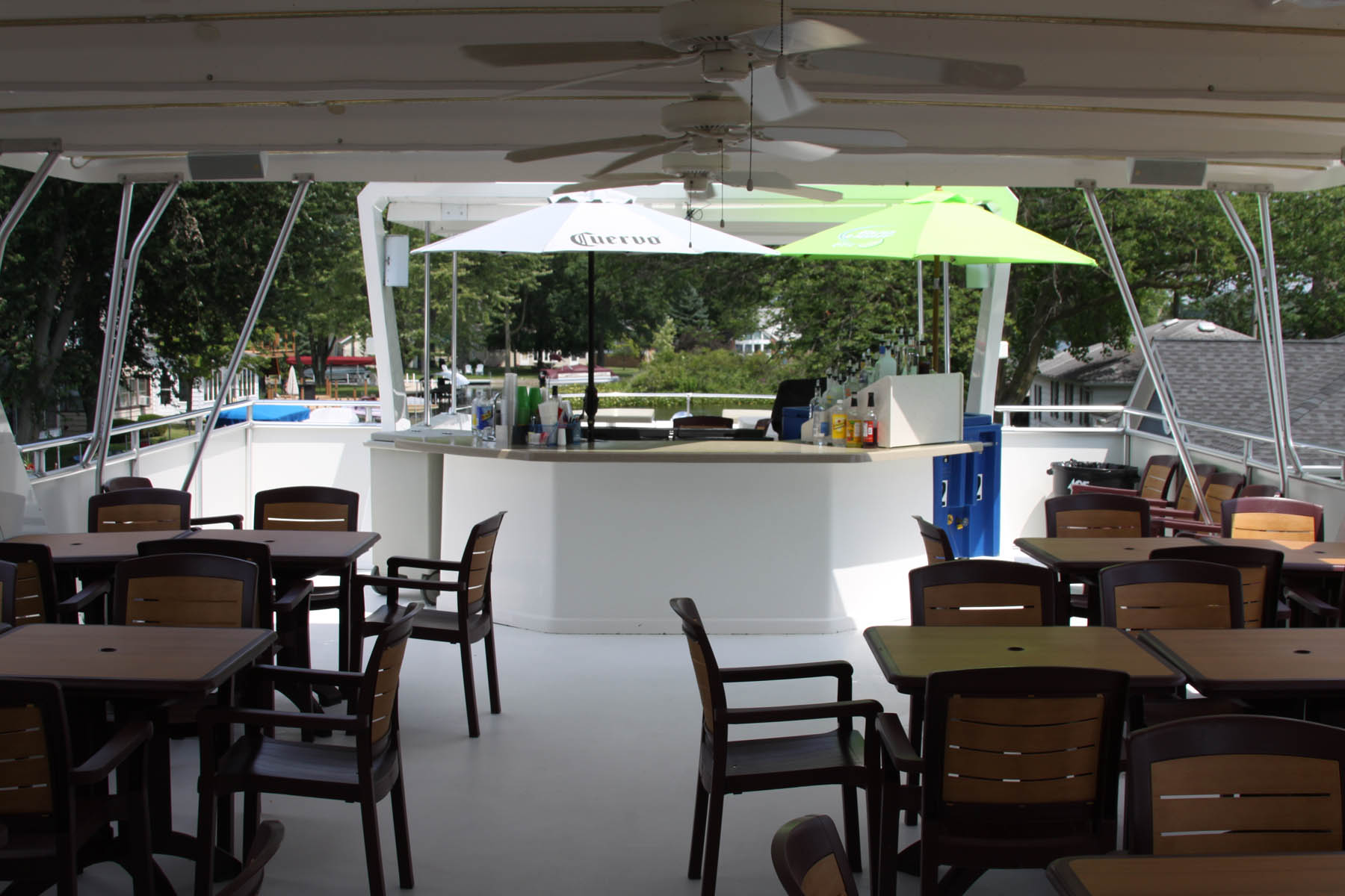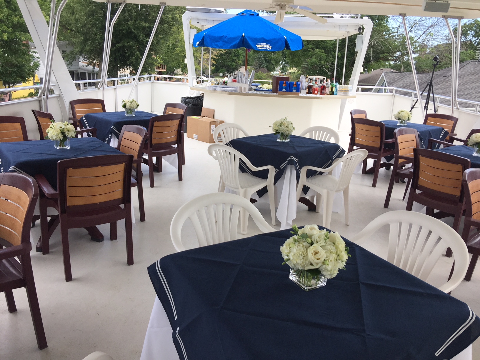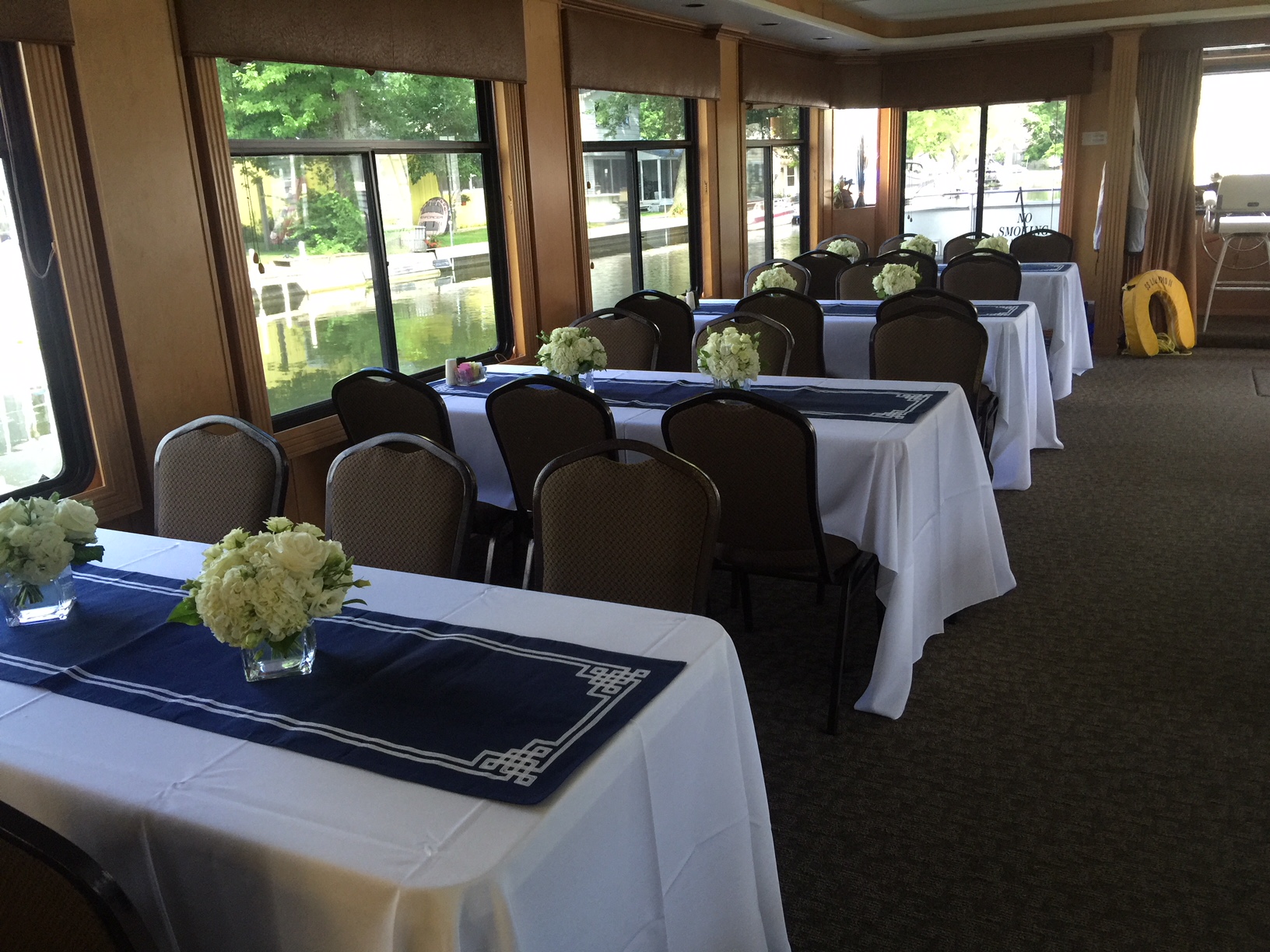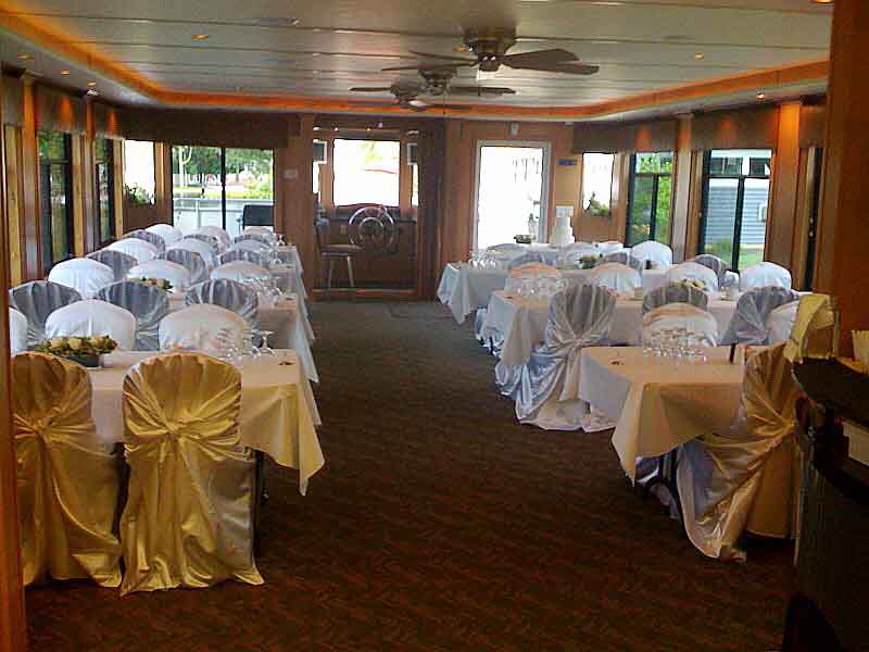 The lower level of the boat seats 60 people comfortably with four 6'x2.5' tables seating 7 per table, three 8'x2.5' tables seating nine per table, and a 5'x2.5' table seating five guests,, and can handle another 60 seated upstairs using up to 12 2.5'x2.5' all weather tables and chairs. A padded seating area at the bow of the boat can accommodate another 15-20 guests. .