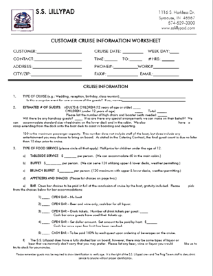 Ready to book your cruise in 2026? Once you decide on the type of cruise you prefer, contact our cruise manager at 574-529-3300 or by email at cruise@sslillypad.com to confirm your date and time slot is open. Download our contract and fill it out with the