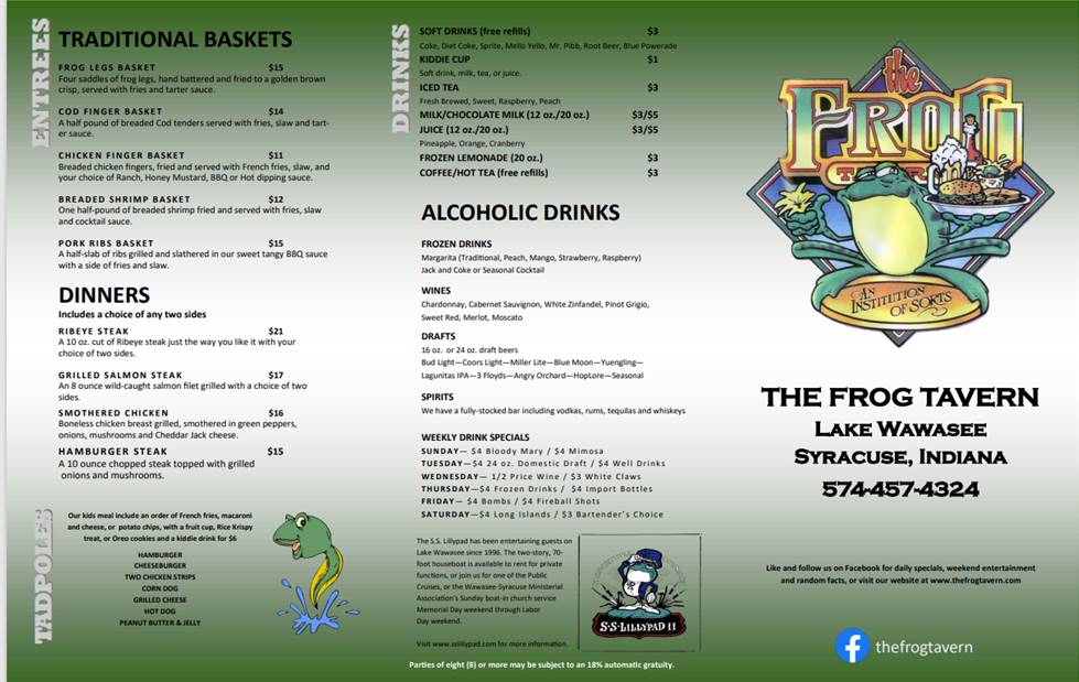 Experience The Frog Tavern for the best food on Lake Wawasee. Our regular menu and daily special meals are sure to satisfy even the pickiest of eaters. Dine-in or call ahead for carryout.